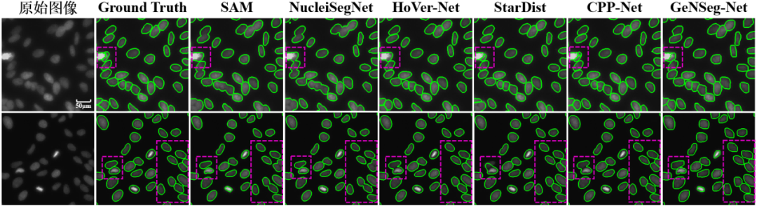 图3 与SOTA算法在DSB2018和BBBC006v1上的定性比较图