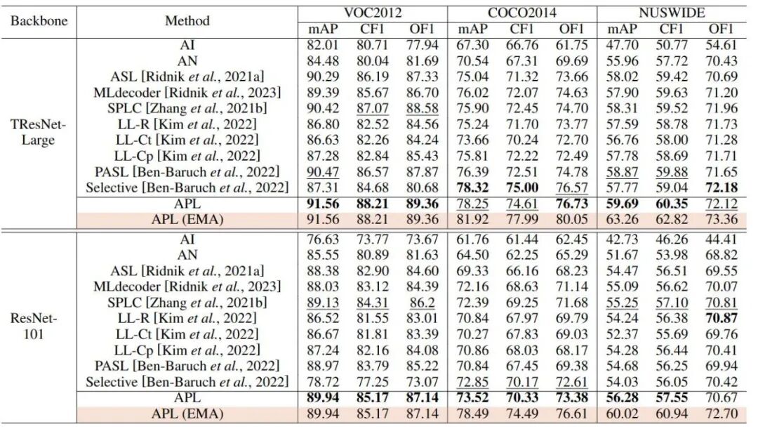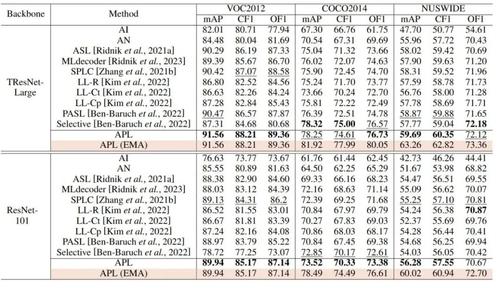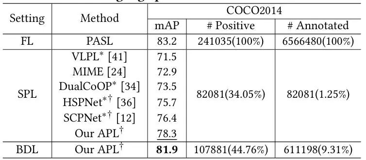 在分组标签的场景中,我们的方法在广泛使用的多标签数据集(VOC2012,COCO2014,NUSWIDE)上实现了最先进的性能,如表1所示。具体来说,在COCO2014上只有9.31%的标注标签,我们的方法达到了81.92%的mAP。另外在单一正标签的场景中,如表2所示,我们的方法超越了之前的相关方法。