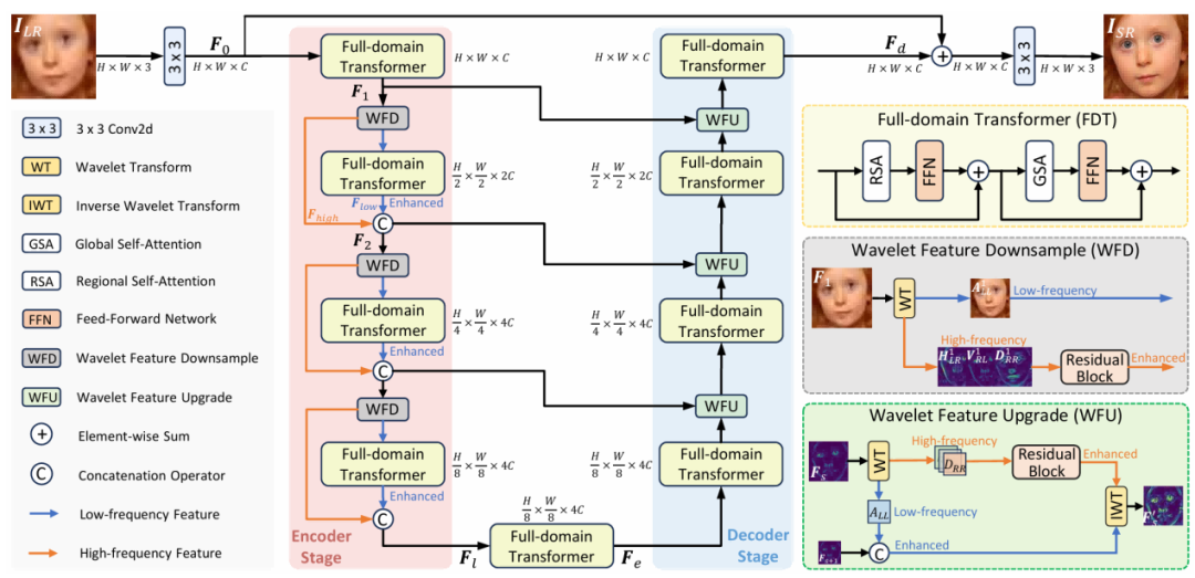如下图2所示,针对给定的退化人脸图像,我们旨在通过采用基于小波的编码器-解码器结构(集成残差块与全域变换器),重建清晰人脸图像。该结构包含基于小波的编码器-解码器架构,其中编码器阶段采用小波特征下采样(WFD),解码器阶段则通过小波特征上采样(WFU)实现图像的下采样与上采样。这些操作负责逐步实现下采样与上采样,构成了我们网络的主要结构。