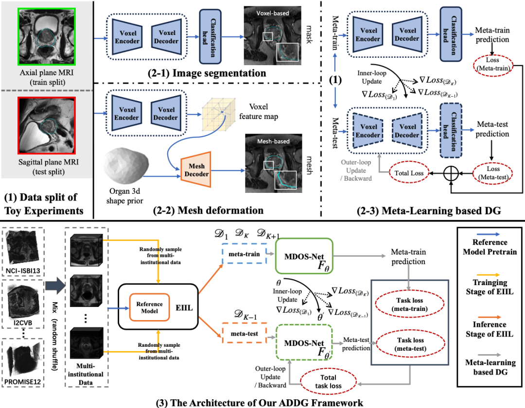ADDG框架旨在从未见过平面的MRI中分割目标器官(前列腺),如图2所示。ADDG由基于网格变形的器官分割网络(MDOS-Net)和无数据划分元学习(DPF-ML)训练策略组成。具体来说,MDOS-Net旨在从单平面MRI中更好地估计前列腺形状,而DPF-ML旨在通过充分利用多个机构的轴向平面MRI来捕获更多域无关的特征表示。