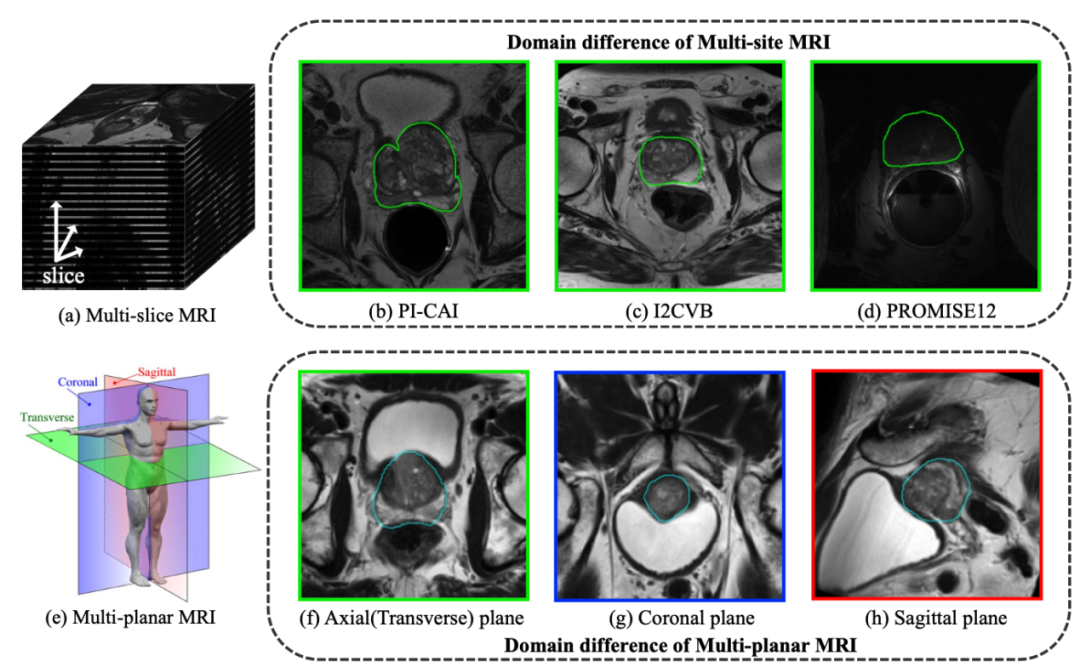 多平面磁共振成像(multi-planar MRI)能够为疾病诊断提供准确的三维结构信息。受制于高昂的标注成本,使得开发适用于不同平面MRI的深度学习分割算法十分困难。为实现精准的多平面图像分割算法,一种思路是将其建模为域泛化(domain generalization)问题。如图1所示,不同于多站点(multi-site)MRI数据存在的站点间数据分布差异,多平面MRI间的数据分布差异是不同方向对相同个体的不同观测结果,是一种由特殊分布差异所导致的域泛化问题。为解决相关方法在跨平面MRI分割上表现不佳这一问题,本文提出了一种自适应域泛化分割架构ADDG,通过加入三维形状约束,显著减轻了不同平面MRI由于大切片间距导致的信息损失的影响;还通过自适应数据划分策略从不同站点的数据中捕捉与域无关特征,进一步增强了模型的泛化能力。