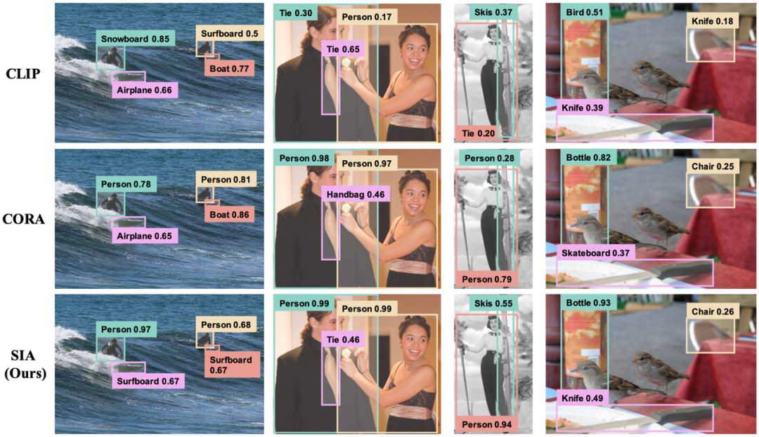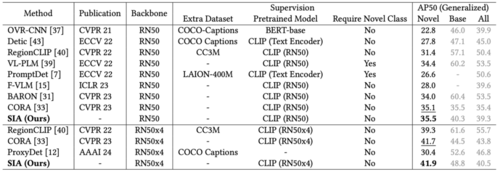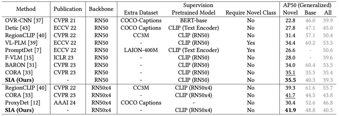 本文主要在COCO-OVD评测基准上进行实验,从COCO数据集中选取了48个带检测框标注的类别(base)用于训练,选取另外17个类别(novel)用于测试,并在训练数据中移除这17个类别的检测框标注。如表1所示,本文方法在RN50、RN50x4两个骨干网络上,均达到了同期最优性能。此外,图3所示,与直接使用CLIP进行区域分类和CORA(CVPR 2023)相比,本文方法SIA对“冲浪板”、“领带”、“滑雪板”、“刀”等无检测框标注的细长形状物体实现了更准确的识别。