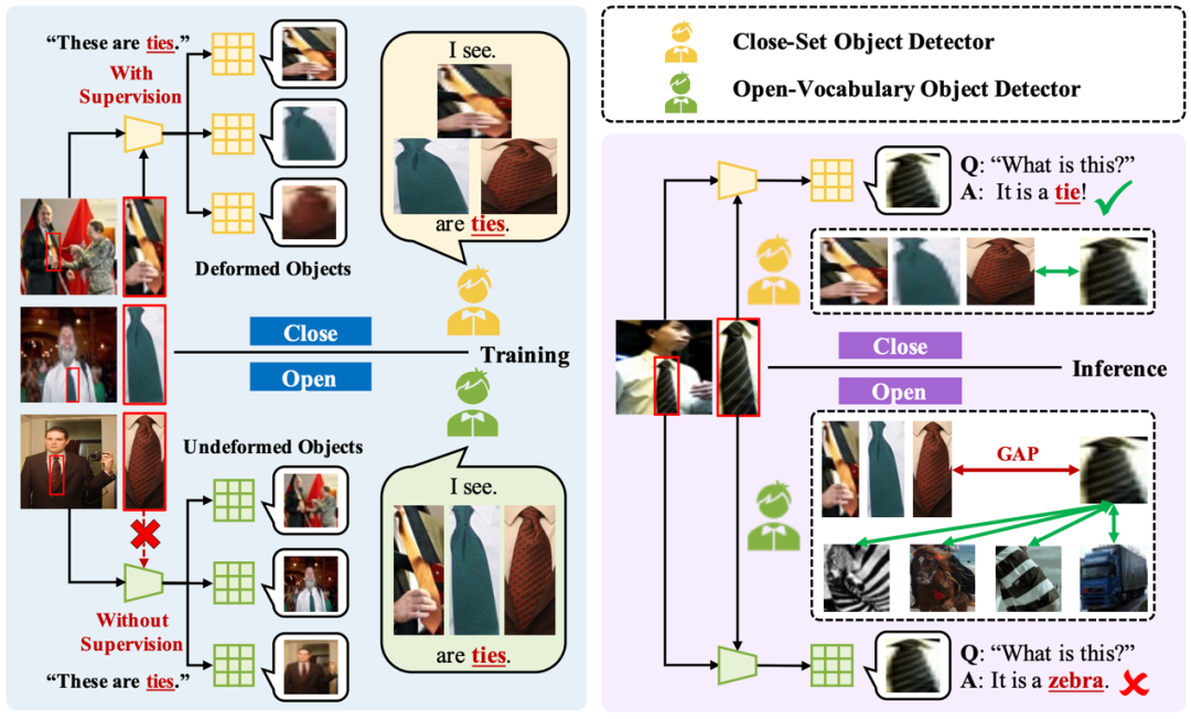 开放词汇目标检测(Open-Vocabulary Object Detection)旨在检测训练数据以外的类别,实现任意类别的目标检测,突破传统目标检测只能检测数据集中已有类别对象的局限性。现有的开放词汇目标检测方法以两阶段(定位阶段+分类阶段)框架为主,定位阶段生成大量类别无关的候选区域,分类阶段通过图文预训练模型CLIP对候选区域进行开放词汇分类,实现任意类别的目标检测。然而,由于图像-区域差异问题,CLIP模型在大规模图像-文本数据上预训练,能够进行零样本图像分类,但用于区域分类时的准确率较低,导致开放词汇目标检测存在错误识别目标对象的问题。