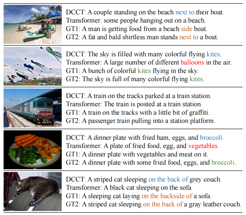 图2展示了本文提出的模型DCCT和Transformer基线生成的描述语句示例,以及人类注释的基本事实句子(Ground-Truth, GT)。可以看到,在第二个例子中,由于基线模型无法对一些冗余特征进行过滤,无法对细粒度信息进行捕捉,导致生成错误的关键描述词“balloons”,而DCCT生成的与GT相同为“kites”。同时,通过补充网格特征来弥补区域特征的缺点,DCCT获取了更精确的位置信息和细粒度信息,比如第一个示例中的“next to”和第四个示例中的“broccoli”。