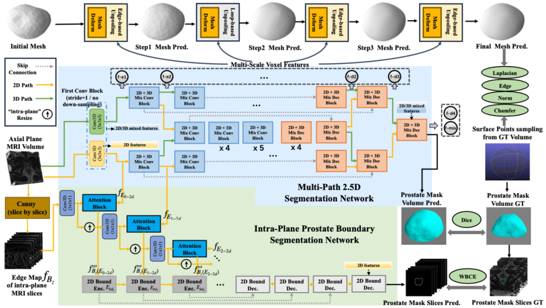 为了更好地利用三维上下文信息来指导跨平面分割,本文基于轴向位MRI构建器官的三维网格模型,然后通过光栅化算法将三维网格转换为体素分割掩码。该思想受到Voxel2Mesh的启发,Voxel2Mesh即使从单平面MRI也具有很强的生成合理形状的能力。然而,Voxel2Mesh没有考虑到单平面MRI存在的各向异性,即切片间距通常比每个切片内单个像素代表的实际距离大得多。MRI的各向异性会造成模型过度拟合切片间的噪声,从而导致性能下降。因此,本文提出了MDOS-Net,它可以更好地利用三维MRI中的丰富信息,以实现更好的跨平面分割。如图3所示,该骨干网络由三部分组成:1)多路径2.5D分割网络,用于处理不同程度各向异性的数据;2)平面内目标边界分割网络,利用各向异性MRI的高分辨率二维图像切片来学习目标器官的二维边缘信息;3)三维三角形网格变形分支,用于精确生成目标器官的形状。
