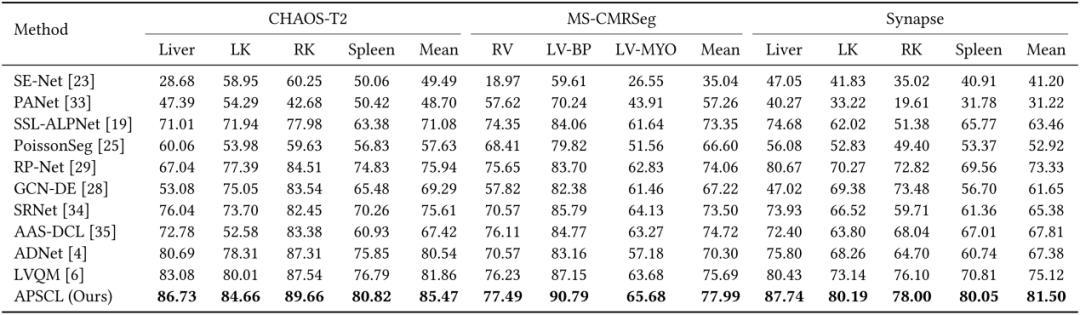在三个公共数据集(如CHAOS-T2、MS-CMRSeg和Synapse)上的实验展示了本框架的优越性,例如,在CHAOS-T2数据集上,在Liver、LK、RK和Spleen四种器官类别上分别提高了最新记录的+3.65%、+4.65%、+2.12%和+4.03%。具体结果见表1。