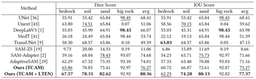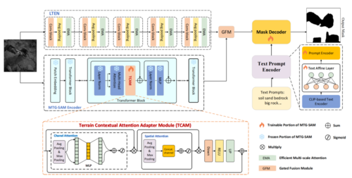 火星地形分割(Martian Terrain Segmentation)在火星车的自主导航、安全行驶以及火星全球地质地貌分析中扮演着关键角色。传统的基于深度学习的语义分割方法在应对火星表面高度非结构化的地形环境时,往往表现出适应性不足和泛化能力有限的问题。为此,本文提出了一种新颖的多视角火星地形分割框架(MTSNet),通过引入火星地形文本引导的SAM(Segment Anything Model)适配器(MTG-SAM) 和局部地形特征增强网络(LTEN),实现全局与局部特征的协同建模,显著提升了多视角火星地形的分割精度。