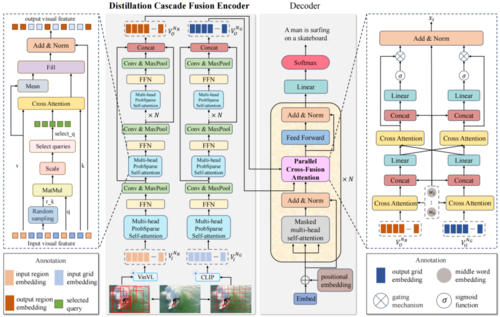 本文提出了一种新颖的蒸馏交叉融合Transformer模型(Distilled Cross-Combination Transformer , DCCT),使得图像描述生成更加的高效和准确。在编码阶段,本文提出了蒸馏级联融合编码器(Distillation Cascade Fusion Encoder, DCFE),通过过滤冗余的视觉特征使得注意力更多的聚焦在重要的特征上面,从而得到更加精炼的特征表示。在解码阶段,本文提出了一种新颖的并行交叉融合注意力模块(Parallel Cross-Fusion Attention, PCFA),该模块将处理后的网格特征与区域特征进行交叉关注,充分将利用了区域特征和网格特征之间的相关性和互补性,之后再通过门控机制调整两种多模态特征对描述生成的重要性和贡献程度,使模型能够更好地利用不同特征的信息,实现全面的多模态信息融合。其中图1展示了本文提出的蒸馏级联融合Transformer模型的整体框架图。