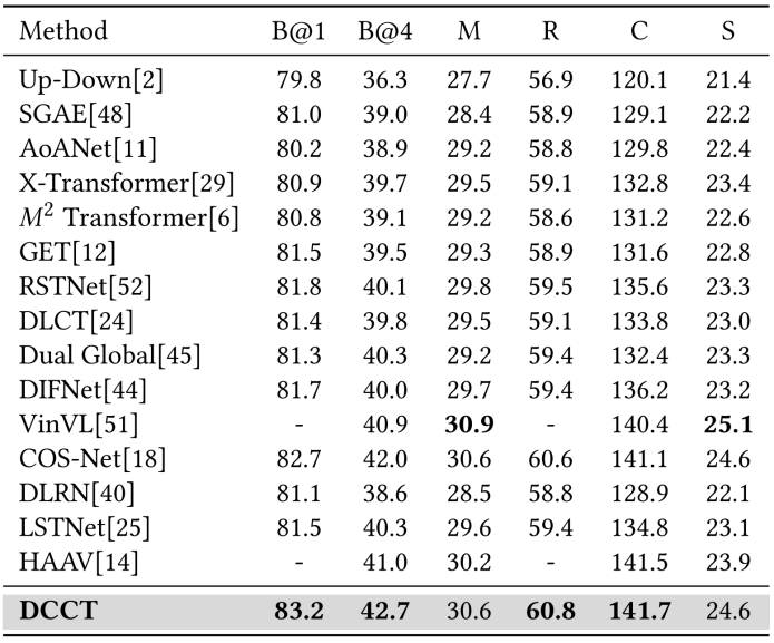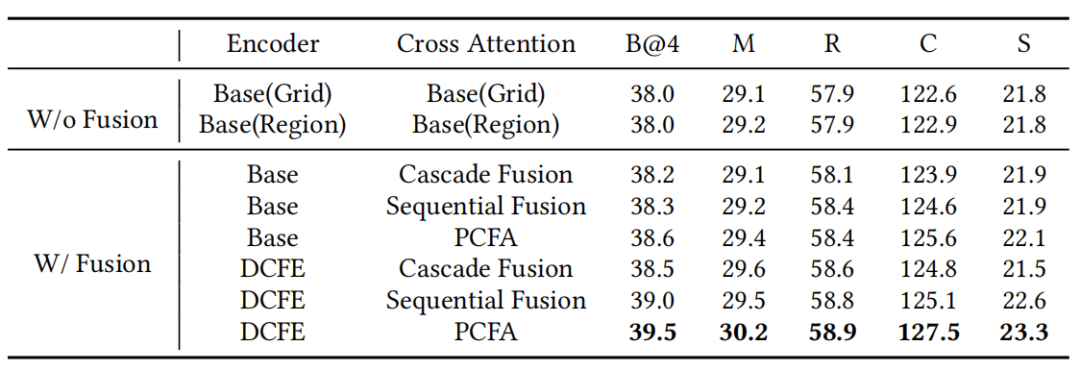 表1展示了DCFE和PCFA是如何影响DCCT在MS COCO数据集的整体性能。可以看到,当在基准模型上配备了DCFE和PCFA之后,CIDEr取得了最佳性能127.5%。