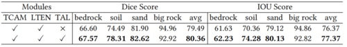 本文在AI4Mars与ConeQuest两大火星数据集上验证了MTSNet的有效性。如表1所示,MTSNet在AI4Mars上平均IoU达到77.37%,显著超越所有对比模型;