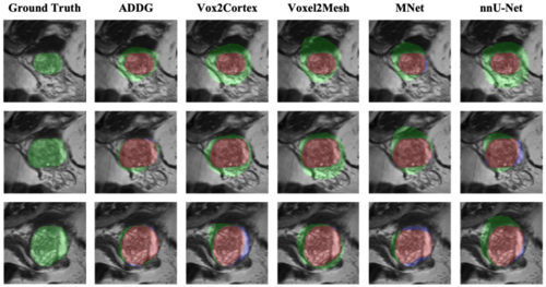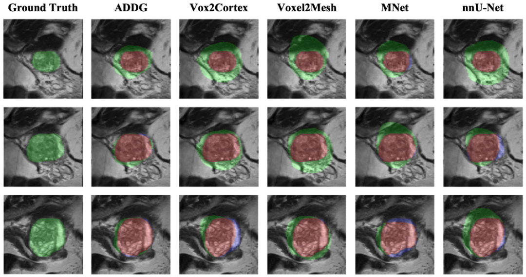 在前列腺多平面MRI数据集PROSTATEx上开展了跨平面MRI分割实验(轴向位作为训练和验证集,矢状位和横断位作为测试集)。结果表明,ADDG相较于其他医学图像分割方法以及域泛化分割方法有着更优的跨平面分割效果。
