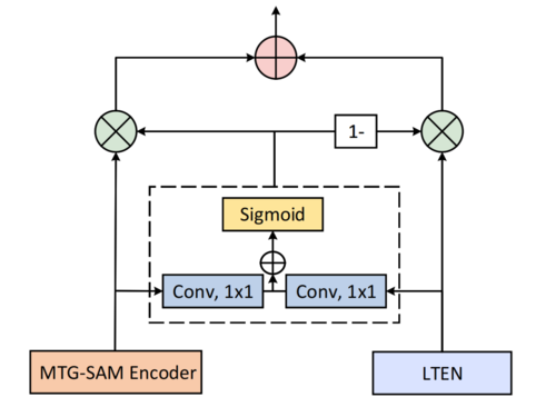 在融合SAM编码器与LTEN提取的特征时,本文设计了一个门控融合模块。该模块通过自适应门控机制融合全局与局部特征,避免冗余,增强分割的鲁棒性。