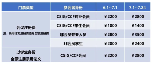 2024年7月1日前通过大会官网注册缴费即可享受最优惠价格。如果您是CSIG/CCF会员,参会价格仅为2200元;如果您是CSIG/CCF学生会员,参会价格仅为1000元。