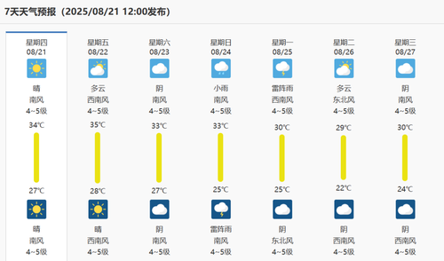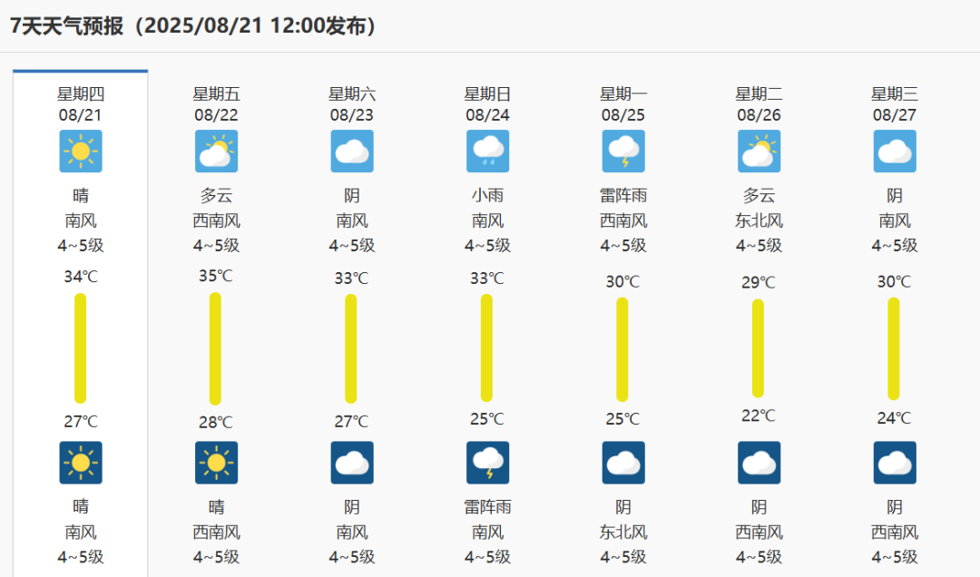 根据中国气象局8月21日中午12点的最新气象预测,会议期间威海市天气以阴天为主,气温维持在25-35℃之间。温馨提示各位与会嘉宾采取适当的防晒措施,并定时补充水分。