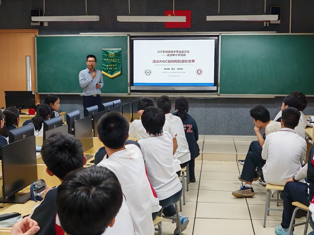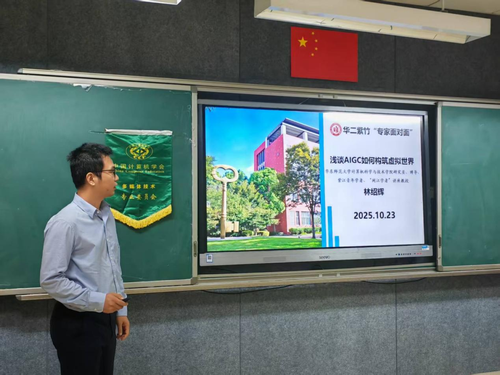 2025年10月23日,为拓宽科技特长学生学术视野,搭建高校与中学的科研交流桥梁,CCF多媒体技术专业委员会执行委员、华东师范大学计算机科学与技术学院研究员、博士生导师、紫江青年学者林绍辉老师受邀走进华二紫竹课堂,以 “浅谈 AIGC 如何构筑虚拟世界” 为主题,为华二紫竹“工程与计算机项目孵化营”的同学们带来一场兼具深度与趣味的 “专家面对面” 专题讲座。